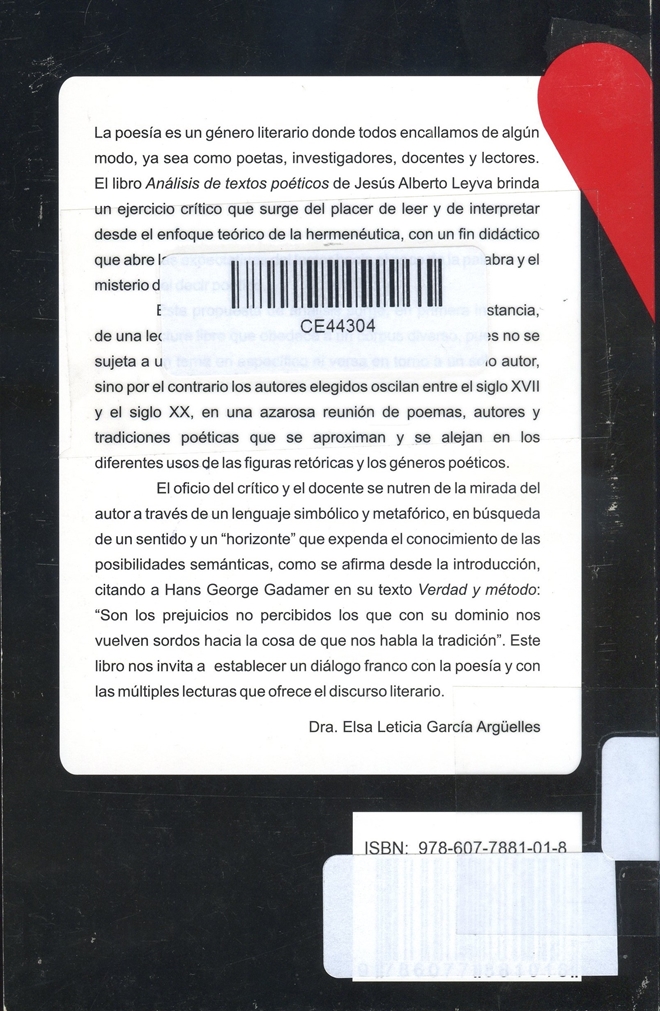 La poesía es un género literario donde todos encallamos de algún modo, ya sea como poetas, investigadores, docentes y lectores. El libro Análisis de textos poéticos de Jesús Alberto Leyva brinda un ejercicio crítico que surge del placer de leer y de interpretar desde el enfoque teórico de la hermenéutica, con un fin didáctico que abre las expectativas del lector hacia el goce de la palabra y el misterio al decir poético.