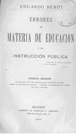 Benot, Eduardo. Errores en materia de educación y de instrucción pública.—Cuarta edición aumentada con los principales decretos de 1898 sobre la enseñanza oficial, y breves consideraciones sobre el plan vigente.—Madrid: Librería de Hernando y compañía, 1899, 662 p.