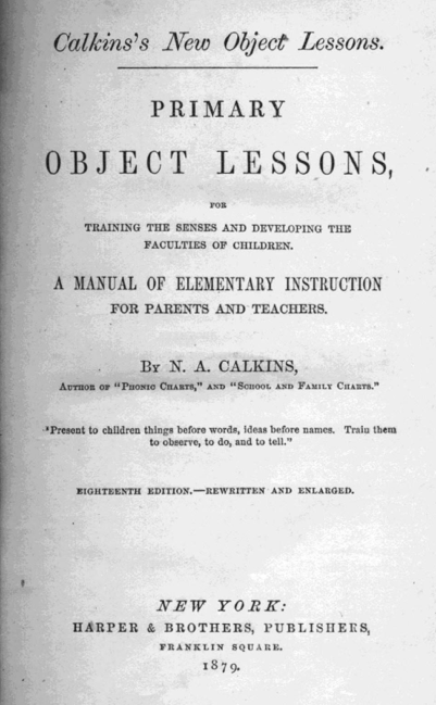 Calkins, N. A. Primary object lessons, for training the senses and developing the faculties of children : a manual of elementary instruction for parents and teachers / By N. A. Calkins. – Eighteenth edition, rewritten and enlarged. – New York: Harper & Brothers, publishers, 1879, xiv, 442 p.