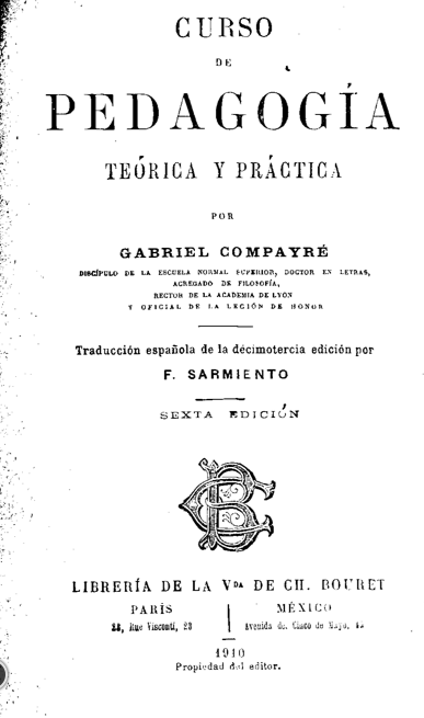 Compayré, Gabriel. Curso de pedagogía teórica y práctica / Traducción española de la décimo tercia edición por F. Sarmiento.—Sexta edición.—París; México: Librería de la Vda. de Ch. Bouret, 1910, 453 p.